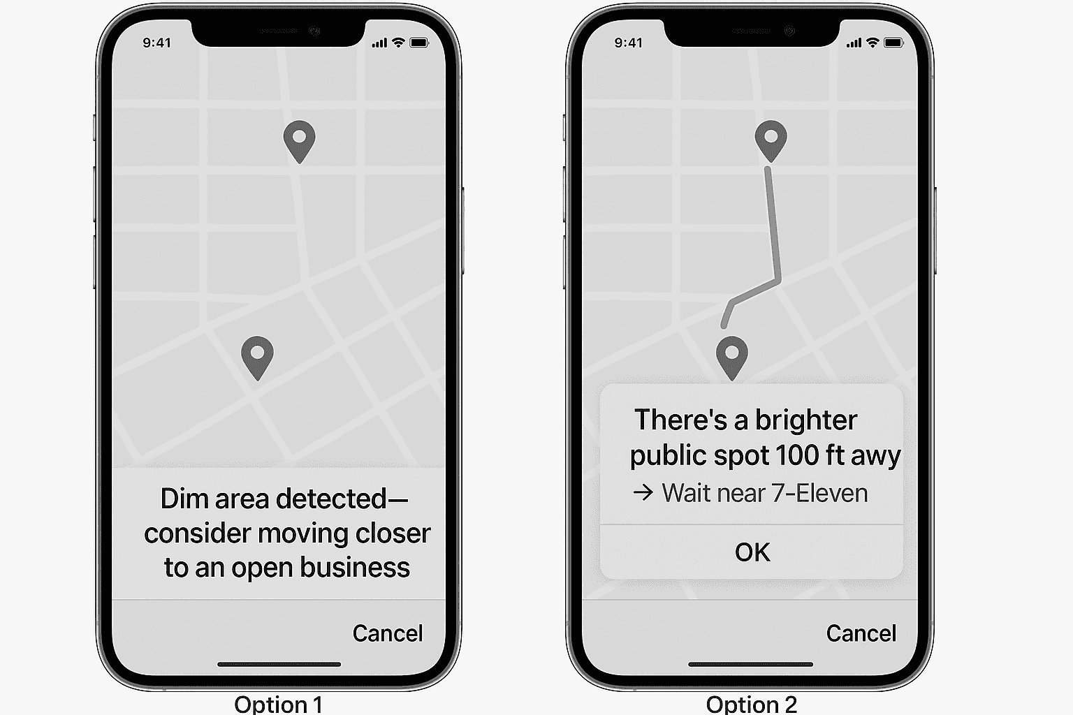 “There’s a brighter public spot 100ft away → Wait near 7-Eleven”